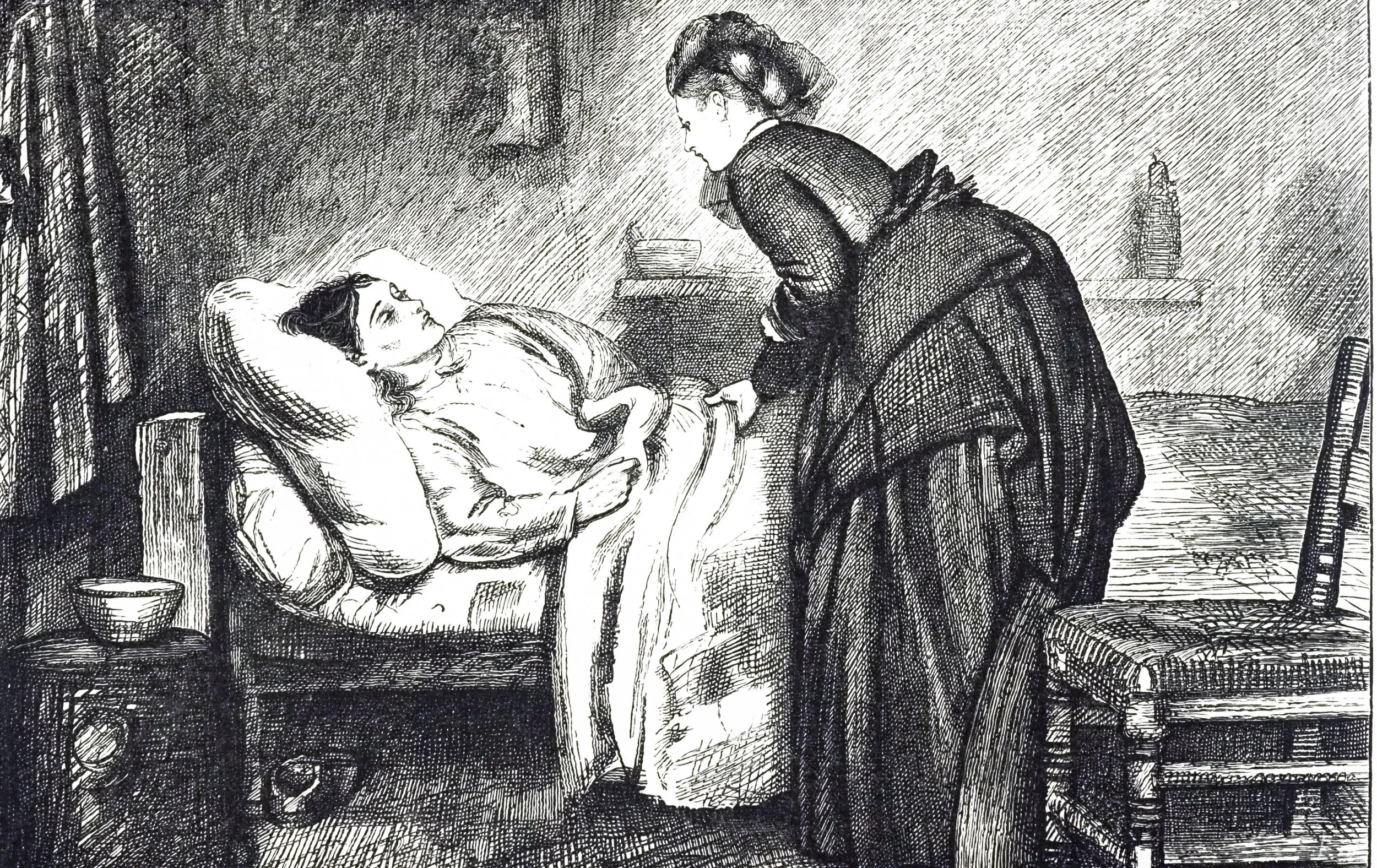 19th-century illustration of a sick woman on a bed in a cottage living room | Francis Wilfred Lawson (1842-1935) | Alamy