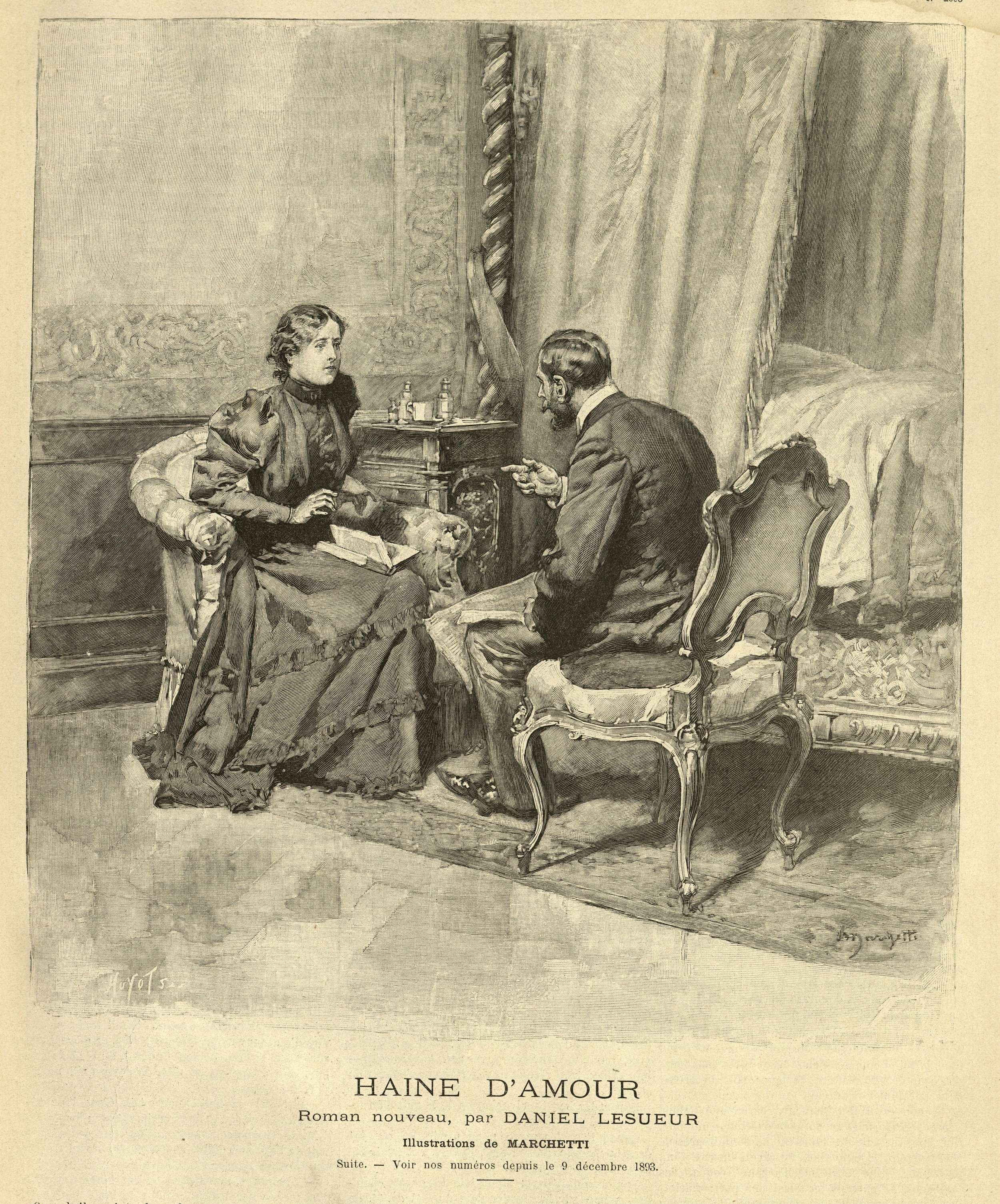 Victorian illustration of man and woman in discussion over a book (c. 1890s) | Alamy